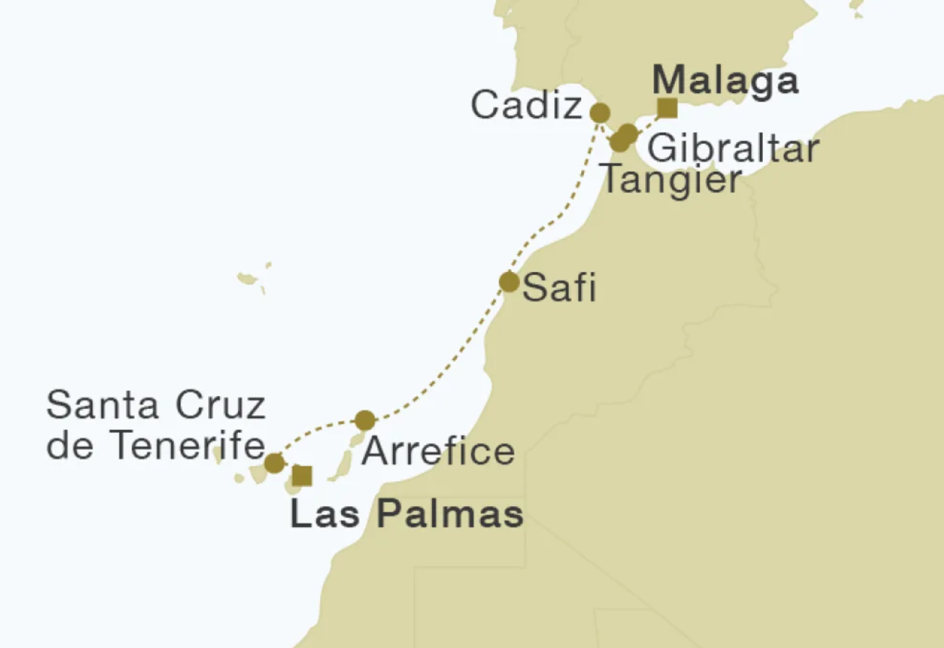 Málaga | Gibraltar | Tangier | Cádiz | Safi | Arrecife (Lanzarote) | Santa Cruz de Tenerife | Las Palmas